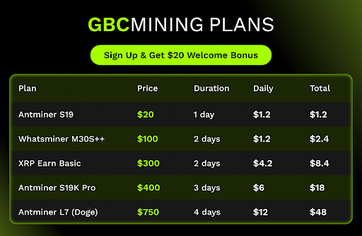 Q: What cryptocurrencies can I mine? A: GBC Mining supports Bitcoin (BTC), Dogecoin (DOGE), XRP, and other major cryptocurrencies through our diversified mining pool allocation system.