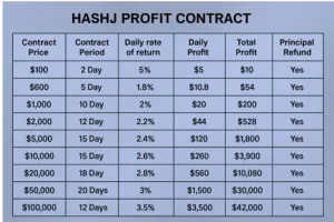 The HashJ provides a variety of contract variants so that the user has the right and ability to choose the investment methods. All the plans are transparent, cost-effective and supported by powerful servers to give the best returns: