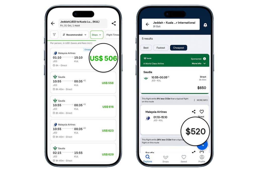 Wego listed a Malaysia Airlines direct flight at $506, compared with Skyscanner’s $520.